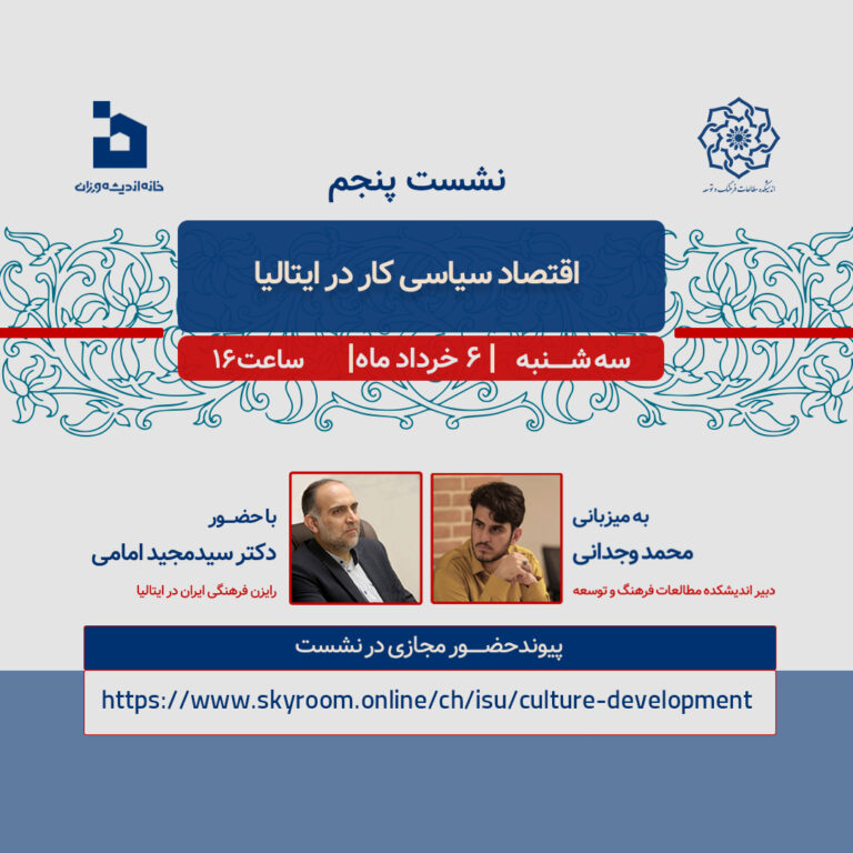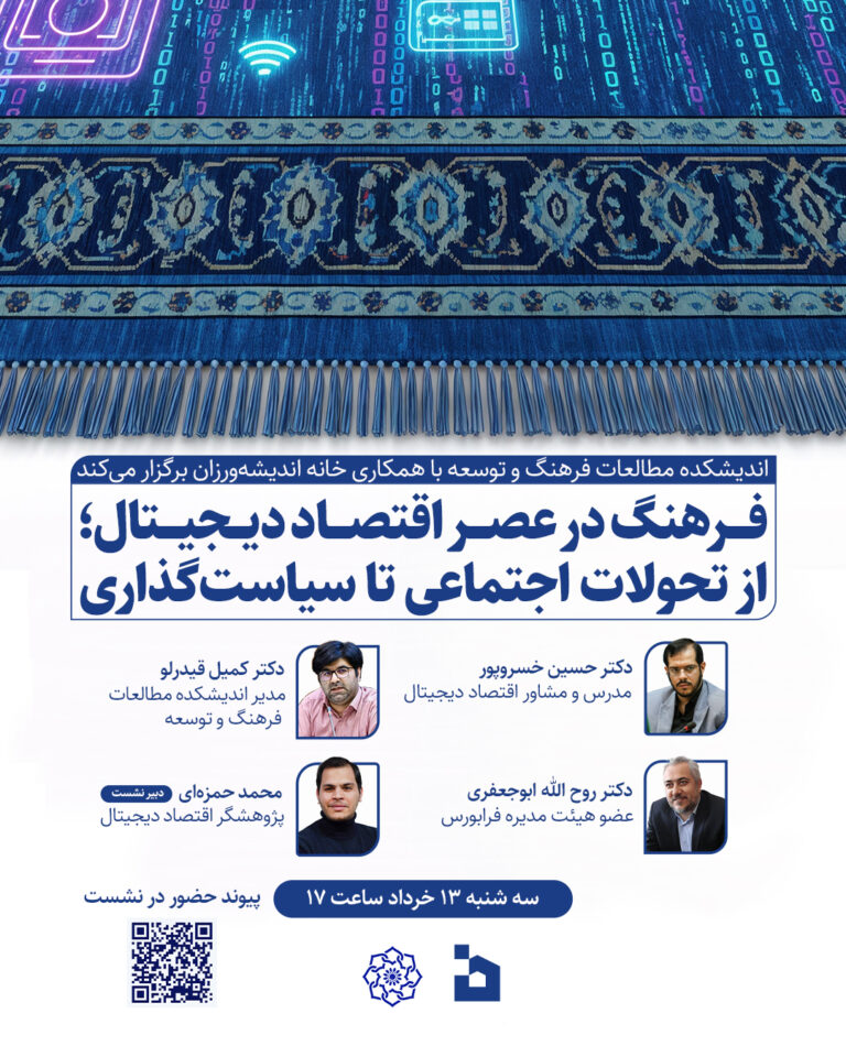 اندیشکده مطالعات فرهنگ و توسعه با همکاری خانه اندیشهورزان برگزار میکند: فرهنگ در عصر اقتصاد دیجیتال؛ از تحولات اجتماعی تا سیاستگذاری باحضور: دکتر حسین خسروپور؛